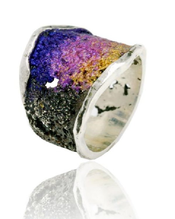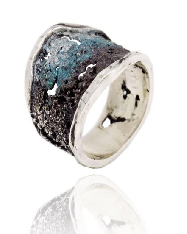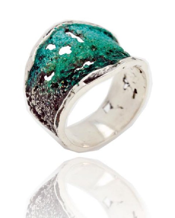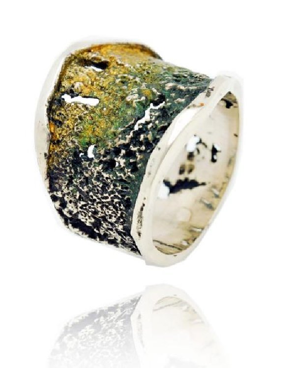 Anillo de diseño rectangular inspirado en la naturaleza, que combina textura y color para un estilo contemporáneo y elegante.
