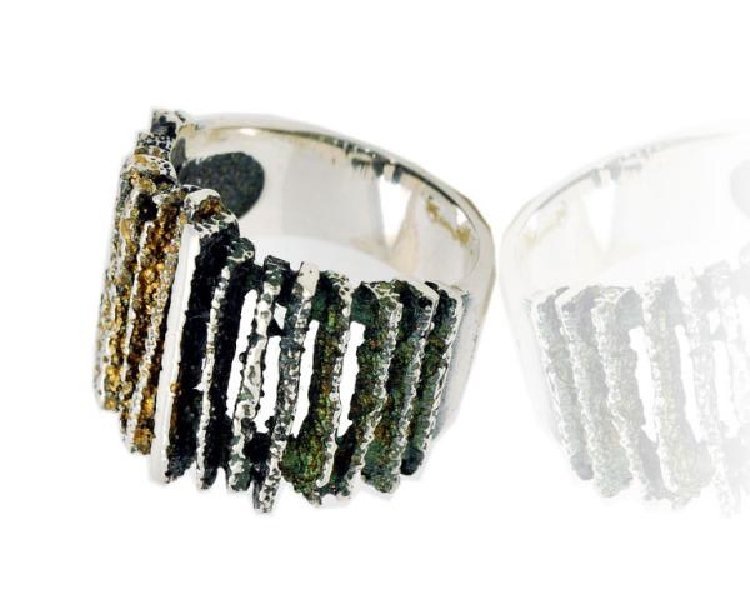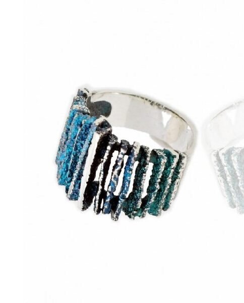 Anillo de diseño inspirado en la naturaleza, que combina textura y color en plata de ley, evocando la delicadeza de juncos agrupados.