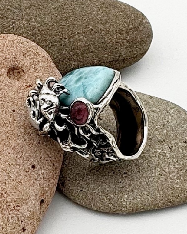 Anillo en plata labrada con Larimar cuadrado y figura de cangrejo en relieve.