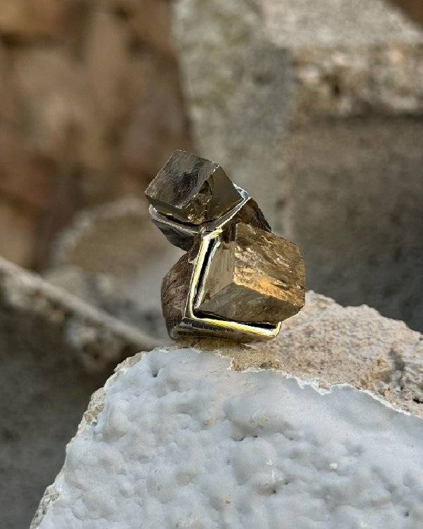 Anillo en plata de ley y oro de 18k. Diseño con dos piezas de pirita cúbicas que recuerdan la forma de un espigón. Pieza única diseñada y realizada a mano por Elisenda Haro.