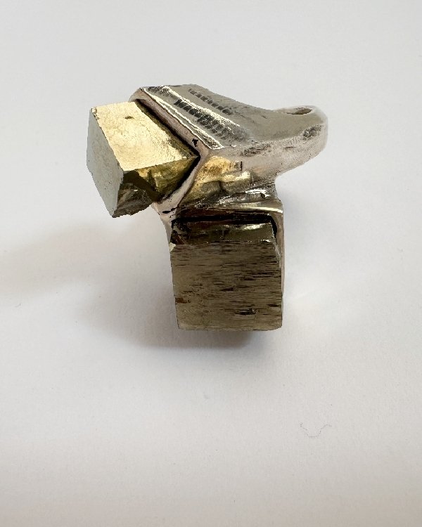 Anillo en plata, oro y dos piritas en forma de cubos. Pieza única.