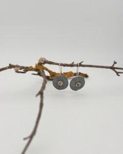 Anillo en plata de ley oxidada y labrada. Diseño con forma alargada y Cianita engastada en oro de 18 k. Pieza única diseñada y realizada a mano por la firma Elisenda Haro.