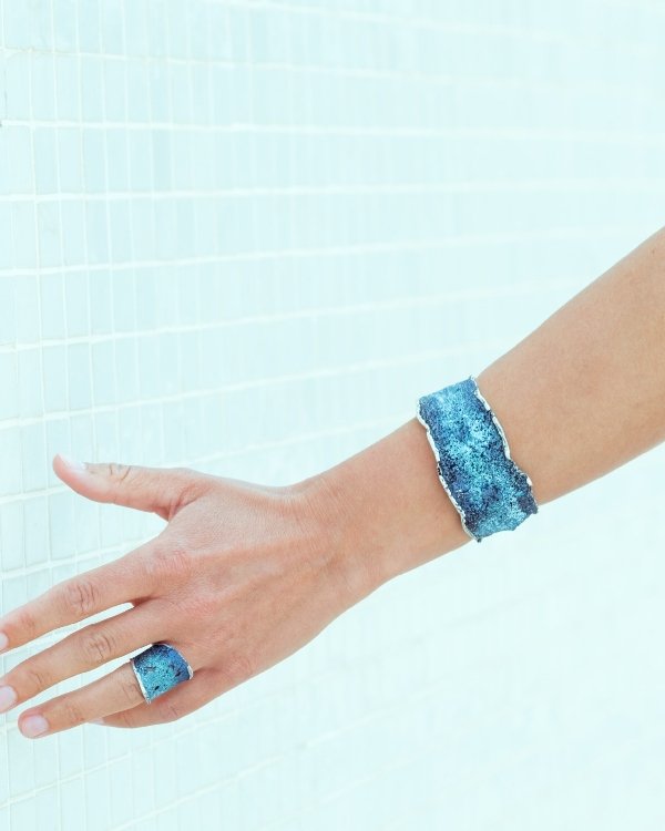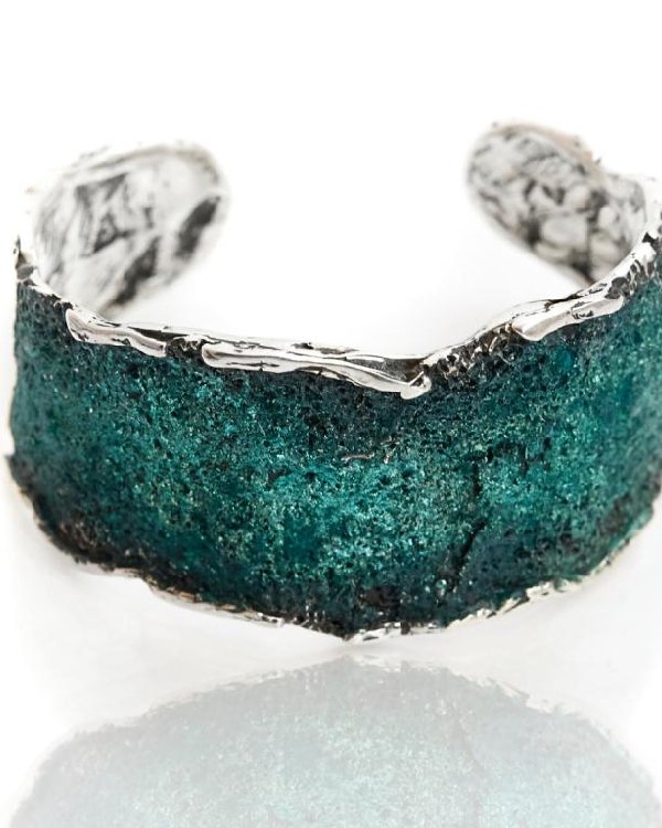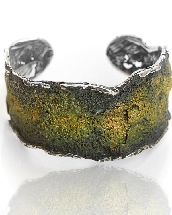Un brazalete rígido de diseño rectangular inspirado en la naturaleza, que combina textura y pigmentación en plata de ley para un estilo contemporáneo y elegante.
