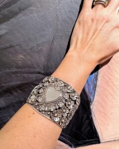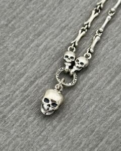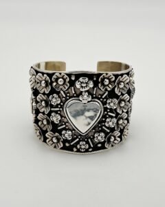 Brazalete en plata de ley con detallada calavera catrina, hojas y flores en relieve. Diseño original elaborado artesanalmente en México.