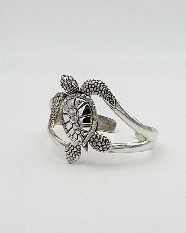 Brazalete rígido y abierto en plata con figura de tortuga marina.