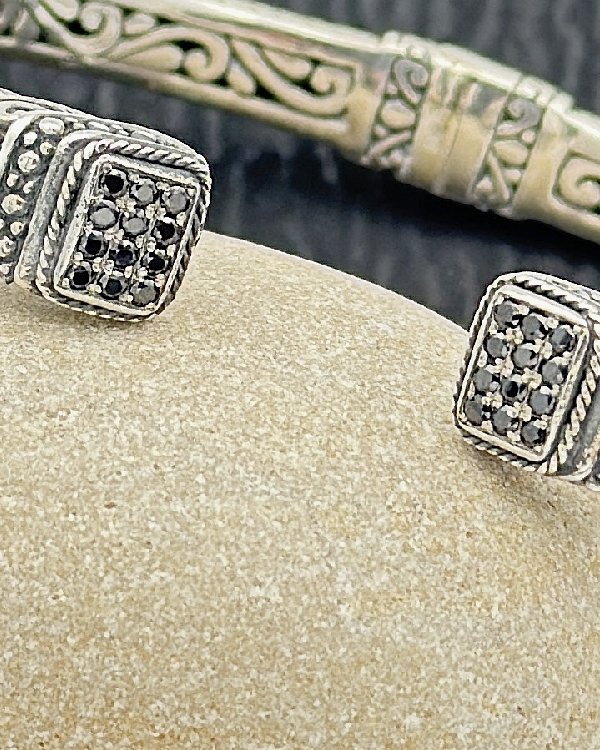 Brazalete rígido abierto en plata de ley labrada con incrustaciones de ónix. Cierre de muelle.