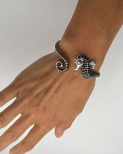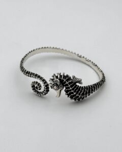 Brazalete rígido abierto en plata de ley con detallados y realistas labrados en relieve y Turquesas que nos transporta a la cultura mexicana.