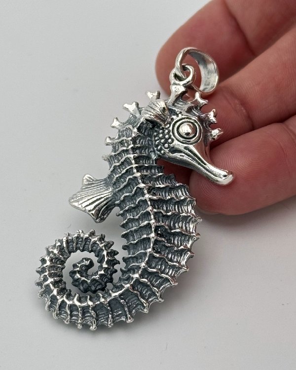 Colgante en plata de ley labrada con forma de caballito de mar. Diseño detallado y realista que resalta la gracia y el encanto de esta animal. Es un símbolo de protección, fuerza interior y perseverancia en la adversidades y los cambios.