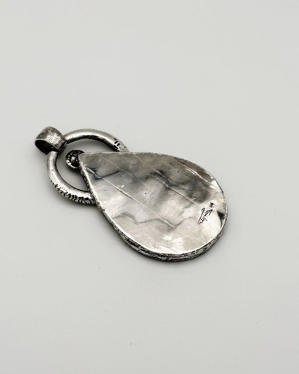 Colgante de Turquesa persa con forma de gota, con incrustación de granate y plata de ley labrada y oxidada. La calidad de la turquesa y la meticulosa forma artesanal en que está elaborado la convierte en piezas muy especiales y únicas. Diseño exclusivo de Toni López.