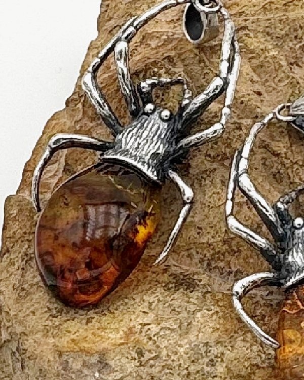 Colgante con forma de araña en plata de ley envejecida y Ámbar de Mar Báltico.