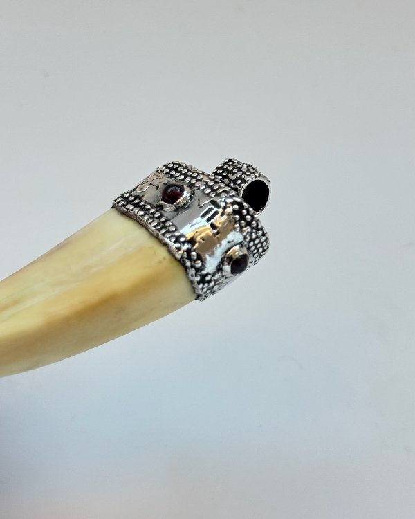 Colgante en plata de ley labrada con incrustaciones de granates y con punta de cuerno de Facochero. Pieza única hecha a mano. Es un diseño atemporal que refleja fuerza y conexión con la naturaleza. Diseñado y creado por Toni López.