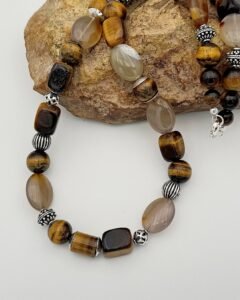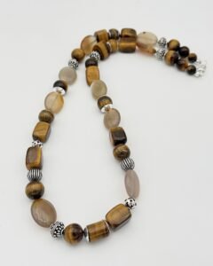Collar largo con cadena y varias piezas rectangulares labradas en plata de ley mate. Cierre marinero.