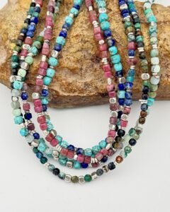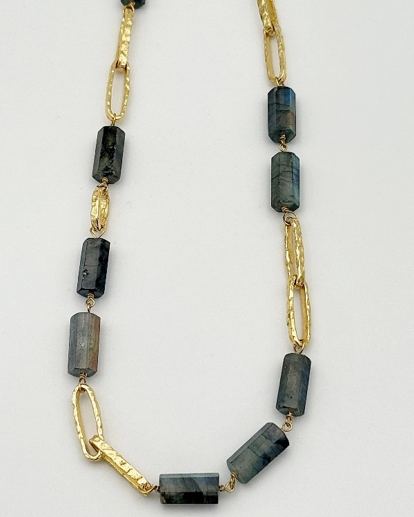Collar de eslabones en plata de ley con baño de oro y piedras tubulares facetadas.