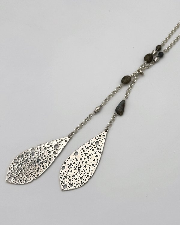 Collar con diseño tipo corbata con cadena en plata y piedras semipreciosas.