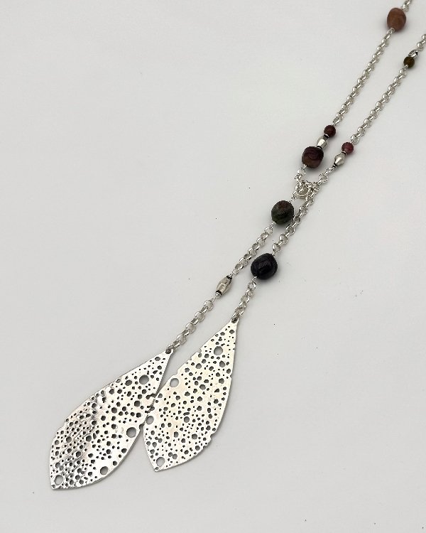 Collar largo con diseño tipo corbata. Cadena de rolo y piedras acabado en colgantes con forma de hoja.