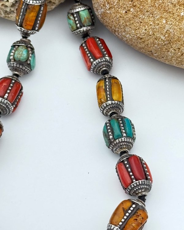 Collar de estilo étnico con cuentas en forma de barril en plata de ley, Ámbar, Turquesas y Coral. Pieza característica de la artesanía tradicional tibetana.