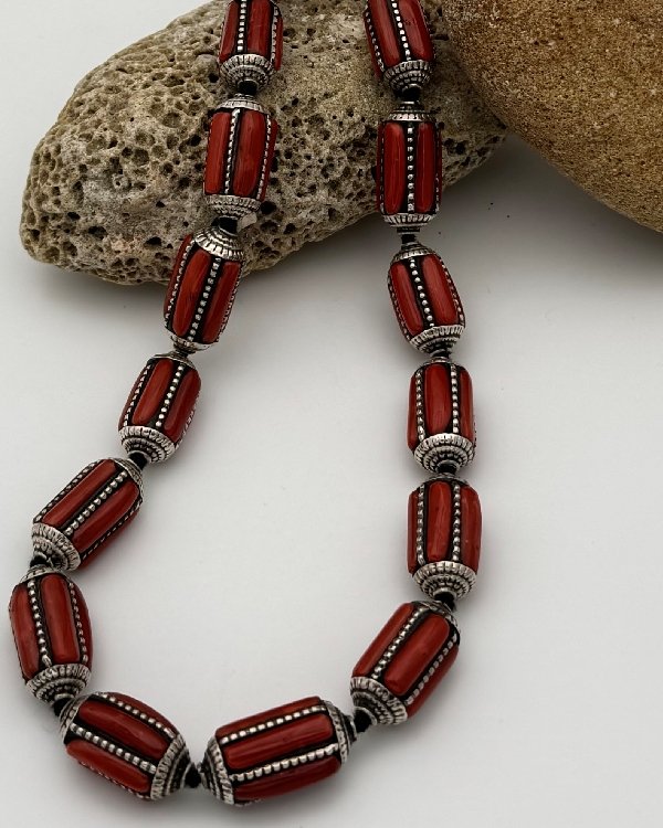 Collar de estilo étnico con cuentas en forma de barril en plata de ley y Coral. Pieza característica de la artesanía tradicional tibetana.