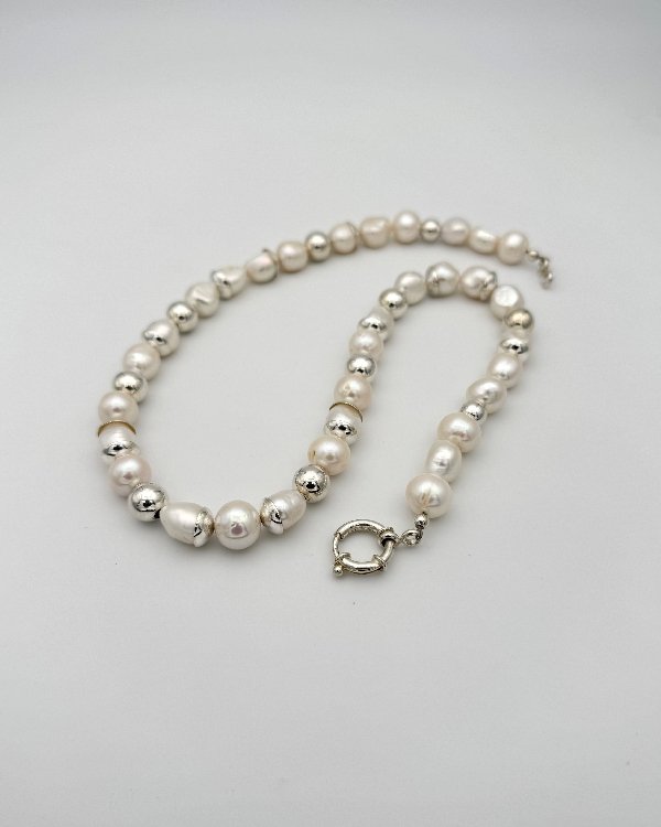 Collar en plata de ley combinada con Perlas Barrocas. Cierre marinero. Diseño de Raquel López.