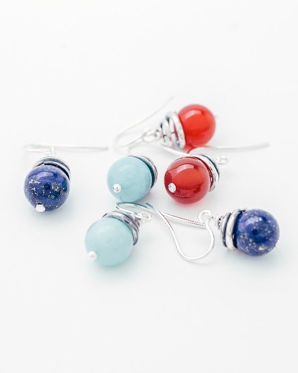 Pendiente en plata con bola de piedra de 10-12 mm con casquilla en forma de rizo.
