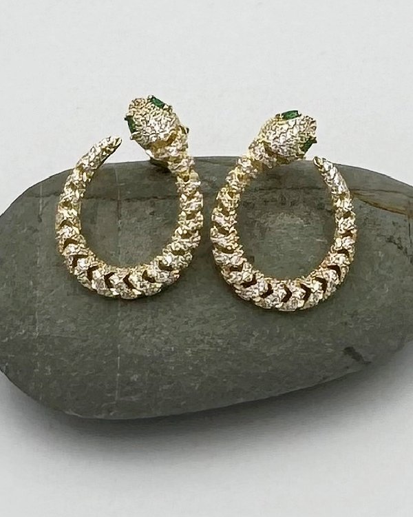 Pendiente con forma de serpiente en plata de ley dorada y circonita. Cierre de presión.