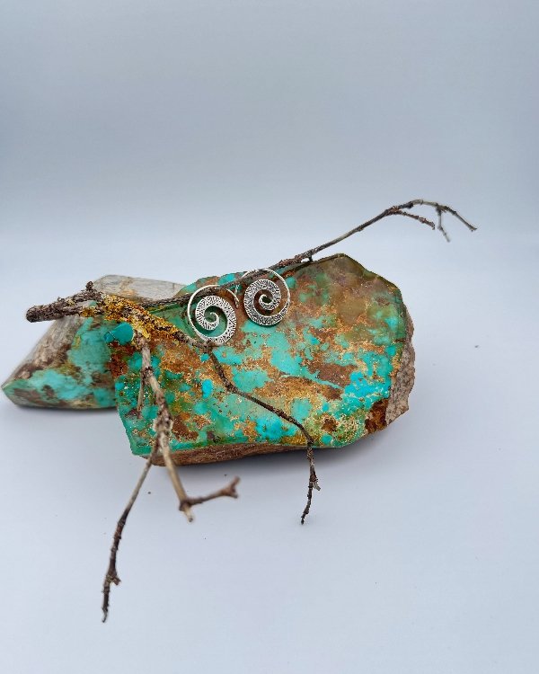 Pendiente en plata labrada en forma de espiral.