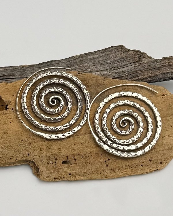 Pendiente en plata de ley labrada con forma de espiral. Estas piezas están realizadas a mano por artesanos de Chiang Mai, zona norte de Tailandia.