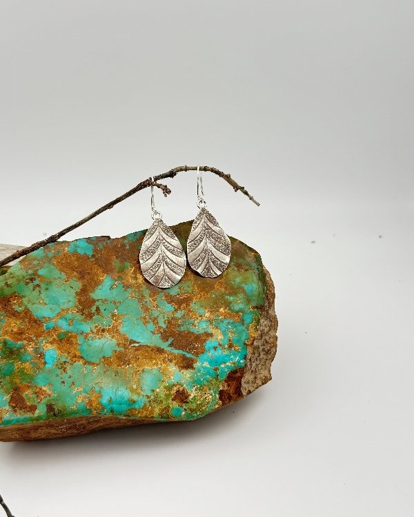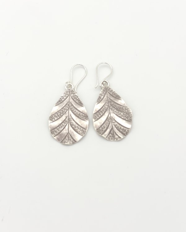 Pendiente en plata de ley labrada con forma de gota y cierre de gancho. Estas piezas están realizadas a mano por artesanos de Chiang Mai, zona norte de Tailandia.