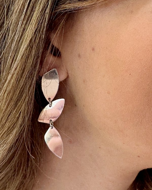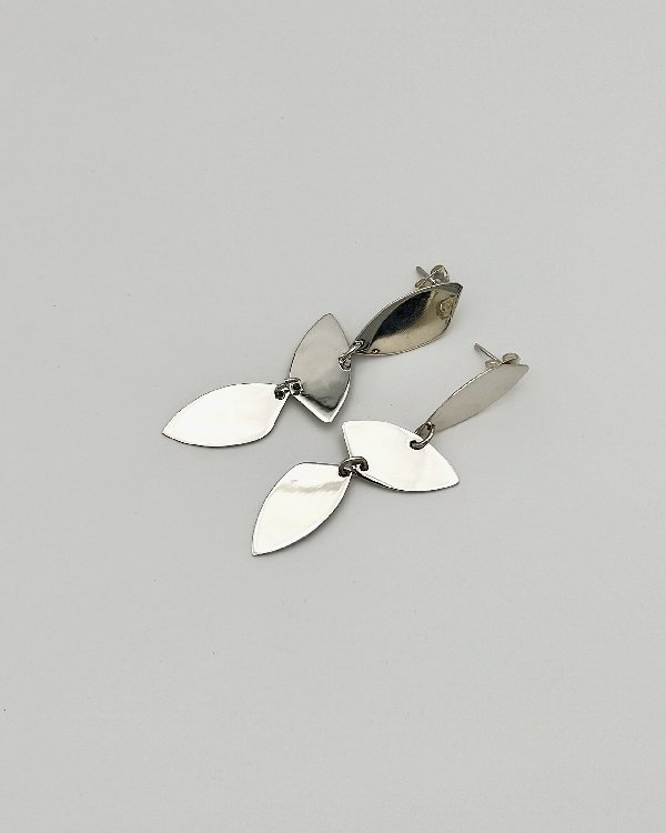Pendiente largo articulado con tres piezas planas e irregulares en plata de ley con acabado liso. Cierre de presión.