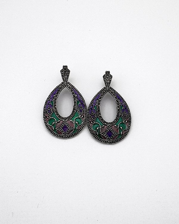 Pendiente en plata de ley alargado en forma de gota. Diseño con esmaltes vidriados en varios tonos con incrustaciones de marquesitas. Cierre de presión.