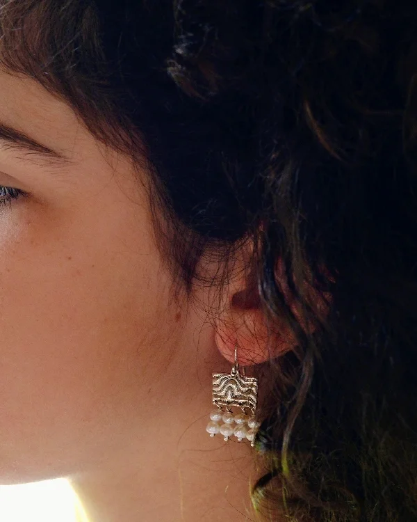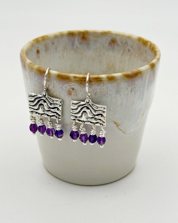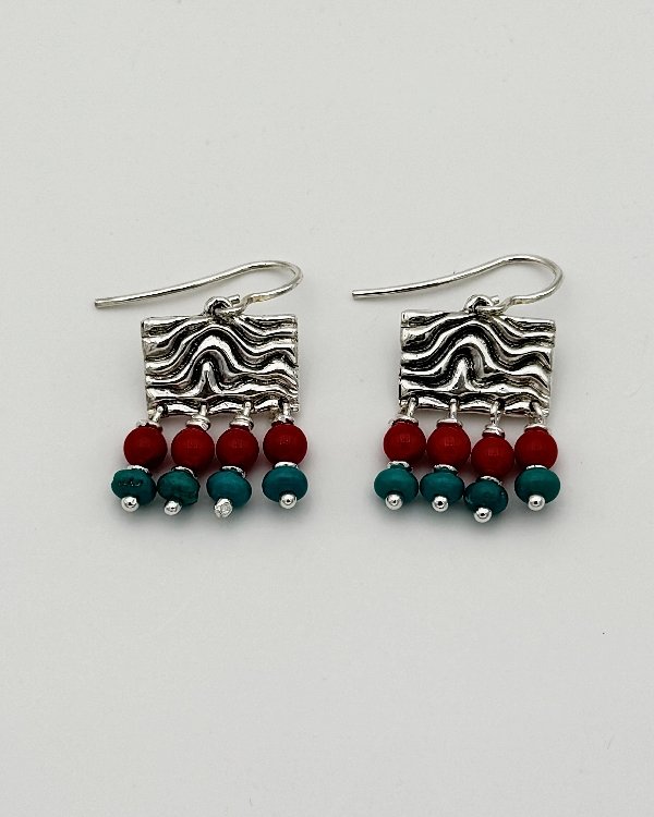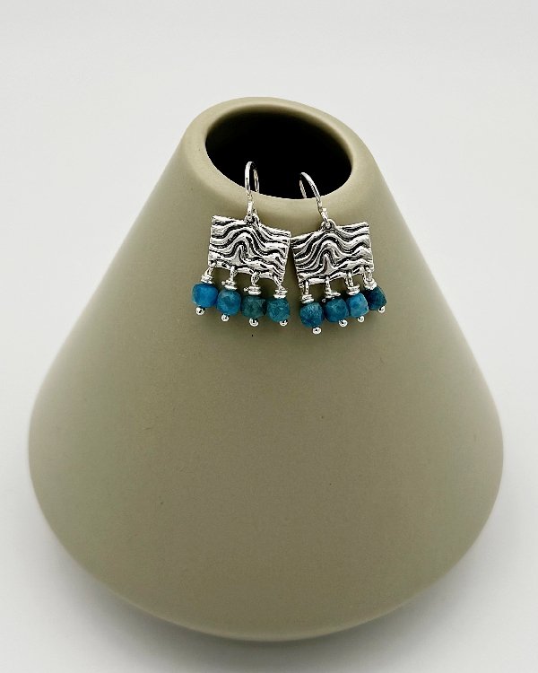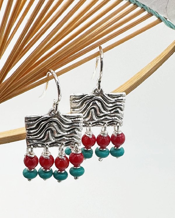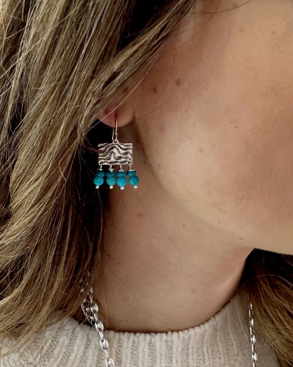 Pendiente de gancho y pieza cuadrada en plata de ley labrada con cuatro filas de piedras semipreciosas. Diseñado y hecho a mano por Raquel López.