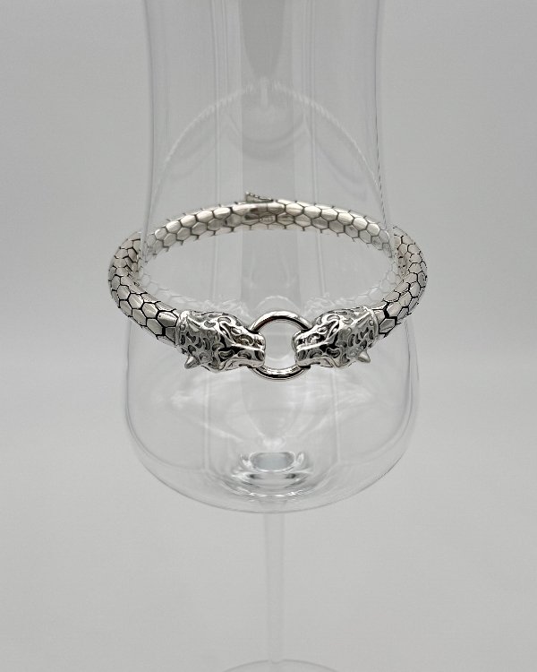 Pulsera de cordón en plata con cabezas de jaguar.