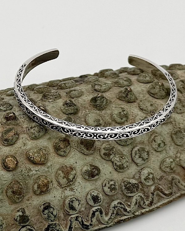 Pulsera rígida en plata con dibujo calado filigrana.