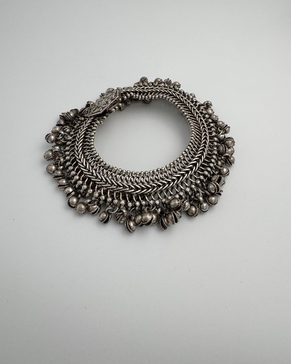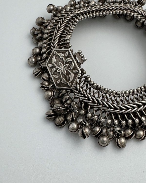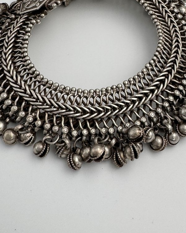 Tobillera étnica en plata, pieza única y antigua realizada a mano en Rajasthan, India. Diseño enmallado con cadena espigada flexible rematada con bolas cascabel y broche de aguja labrado.