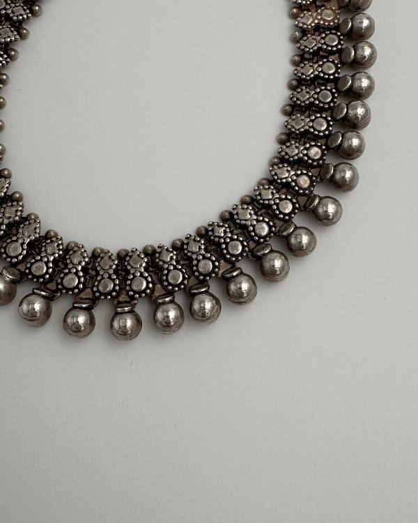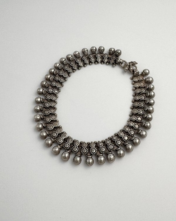Tobillera semirrígida en plata de ley labrada con remate en bolitas de plata lisa.