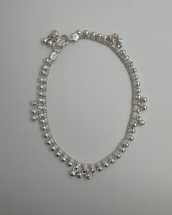 Tobillera en plata con cadena barbada y colgantes de bolitas.