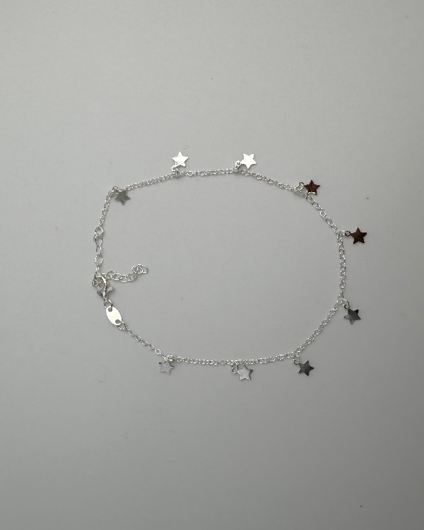 Tobillera en plata de ley con cadena y colgantes en forma de estrella.